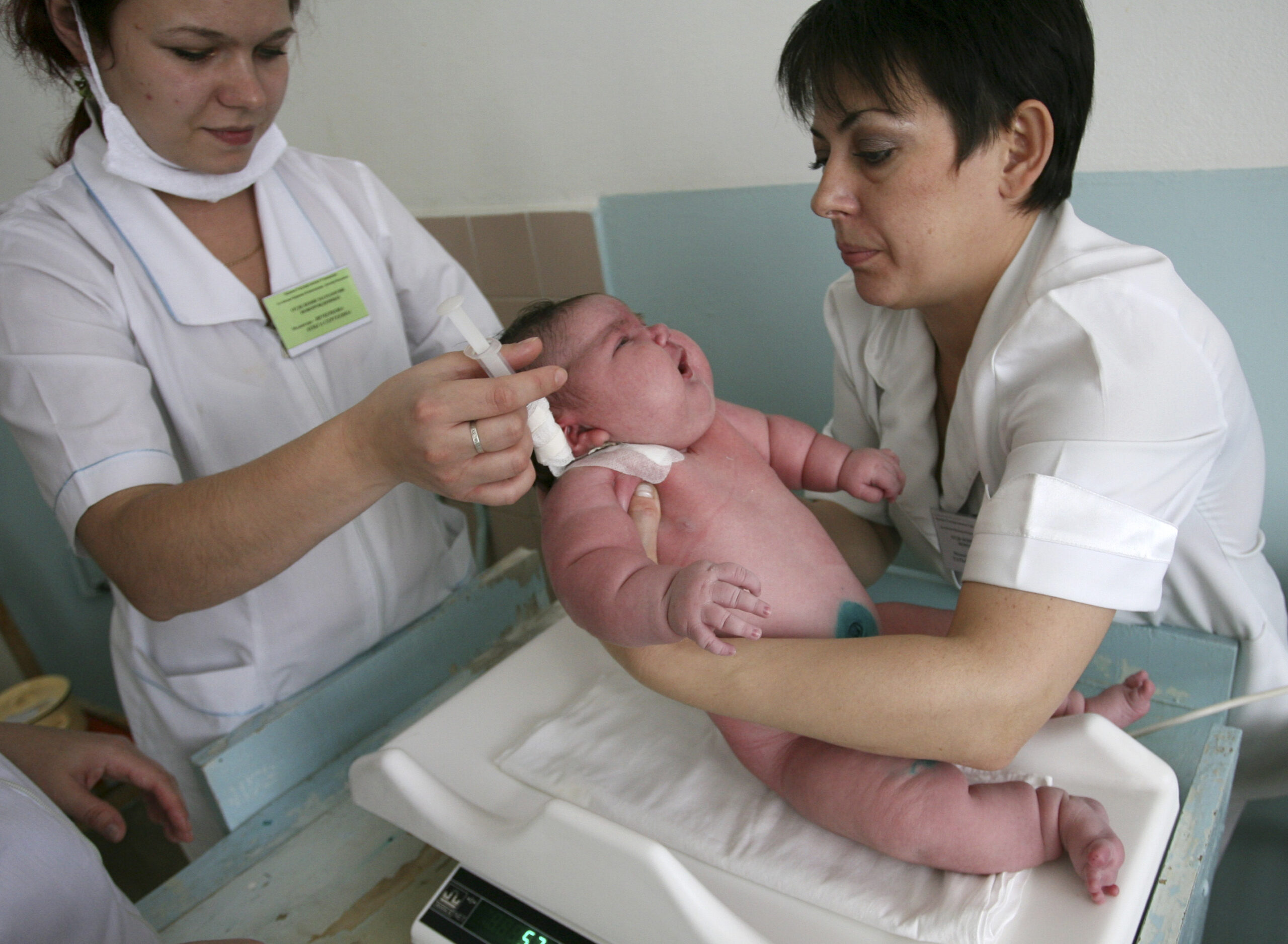 Фото: Медсёстры взвешивают младенца в одном из роддомов Барнаула. REUTERS/Andrey Kasprishin